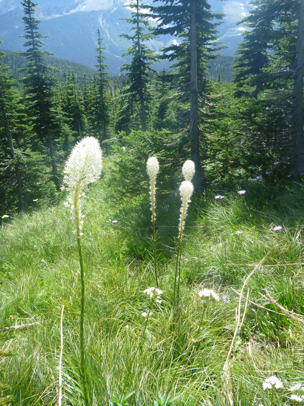 Halfway up the trail, I got to Summit Lake for a short break, then continued up the slope of Mt. Carthew towards the summit. It was a sustained moderate grade through the evergreens until it broke into alpine meadow with lots of flowers. But what was most beautiful was beargrass. It is a baseball sized bunch of white flowers on a long stem that blooms only every 7 years!